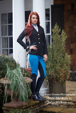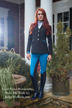 When it comes to choosing an equestrian jacket, two things are of vital importance: style and comfort. Hayward Sportswear Ltd. offers quality individually tailored riding apparel that is also light and breathable for maximum comfort. We love this beautifully cut show coat with brass buttons and peacock blue piping on the pockets, especially when it’s combined with these striking ocean blue breeches by FairPlay from California’s Gee Gee Equine.