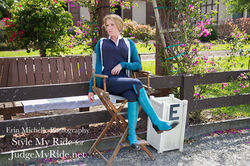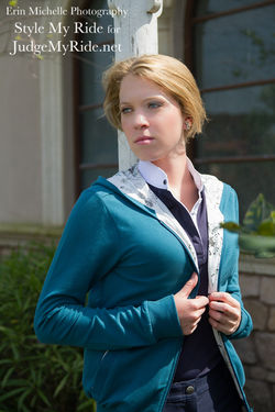Zone 2 Jumper rider Taylor Burns surveys the Dressage arena at Caroline Roffman's Lionshare Farm in Wellington, Florida. Here Taylor models a duet of Blues - in Navy and Turquoise. Her navy sleeveless shirt features a white competition collar, by Equline America. The cotton hooded jacket, also by Equiline America, is a beautiful shade of Turquoise blue. The Tailored Navy Equiline America breeches with matching navy knee patch, offer a beautifully streamlined fit and look. Our Vincero boots in a rare Robins Egg Blue, with Black spectator top, toe and heel caps match the jacket exactly. We were delighted by the reaction to these unconventional boots from the riders at WEF and how many people wanted to buy them right off the models!